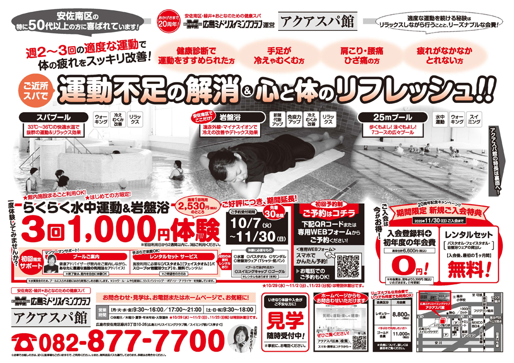 HOME > 広島ミドリスイミングクラブ アクアスパ館 らくらく水中運動&岩盤浴 3回1,000円体験 【ご予約フォーム】 ■ 初回体験希望日(必須) ■ 氏名(必須) ■ ふりがな (必須) ■ 年齢 (必須) ■ 住所 (必須) ■ 連絡のつきやすい電話番号(必須) ■ メールアドレス (必須) ■当体験を何で知っていただきましたか? (必須) 折込チラシホームページInstagram知人の紹介館内告知 ■ メッセージ ※お問合わせ内容、連絡のつきやすい時間帯など、自由にご記入ください。 ご予約ありがとうございます。 確認次第、当館スタッフより翌営業日までに 折り返しご連絡させていただきます。 2025年9月5日 author